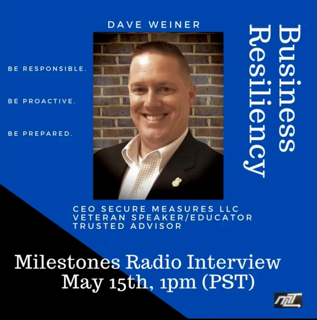 Secure Measures, LLC CEO Dave Weiner was on Milestones Radio yesterday discussing with hosts Heidi J. Hilton, MBA and Craig Coughlin steps businesses and organizations can take to make their business more resilient and steps to take to to mitigate and recover from business disruptions.